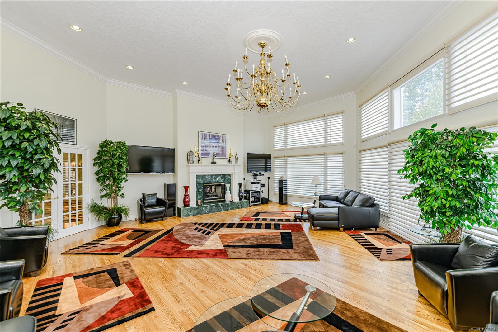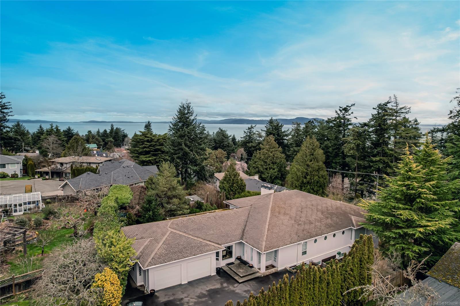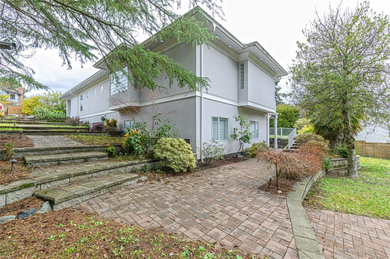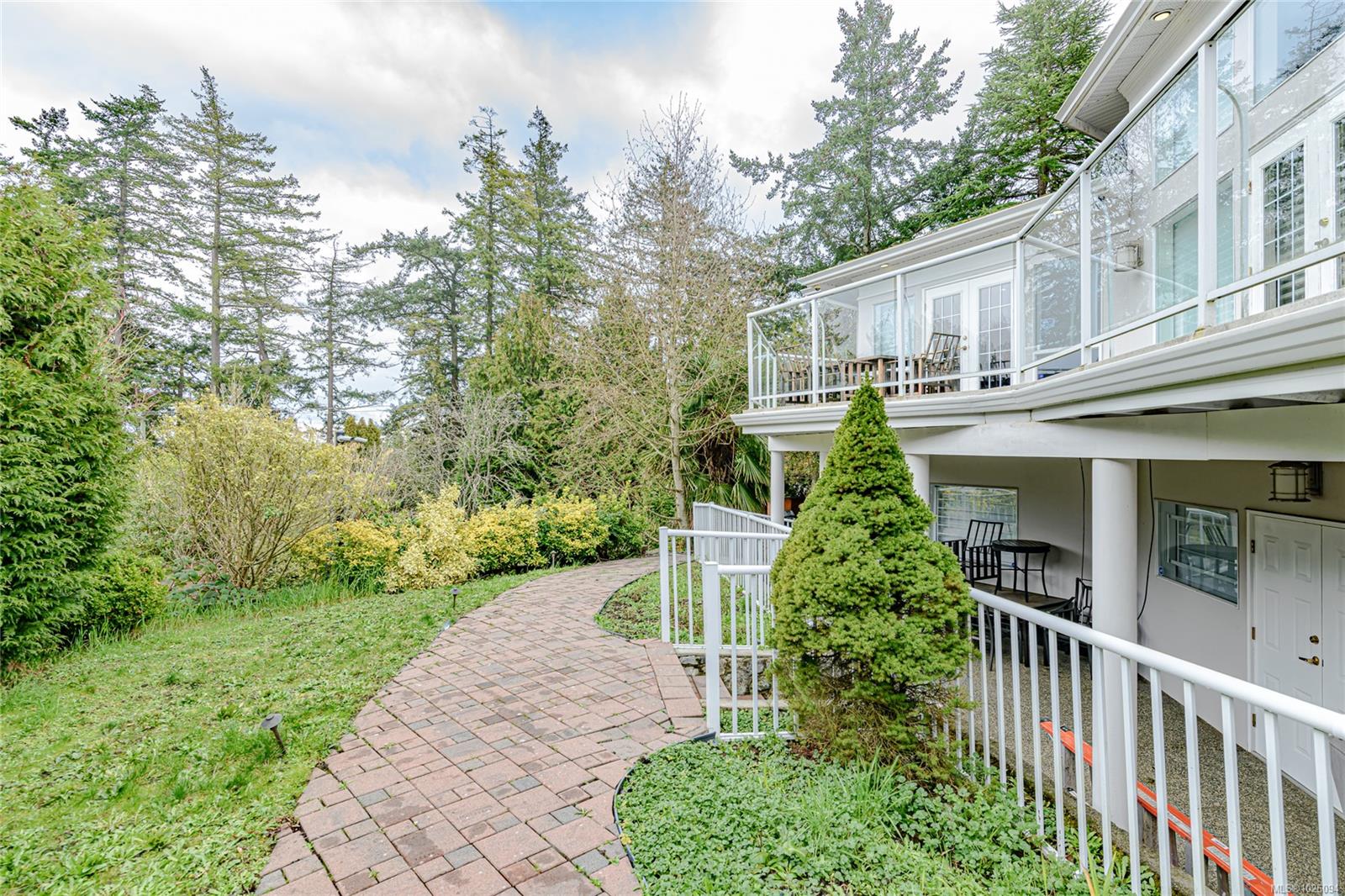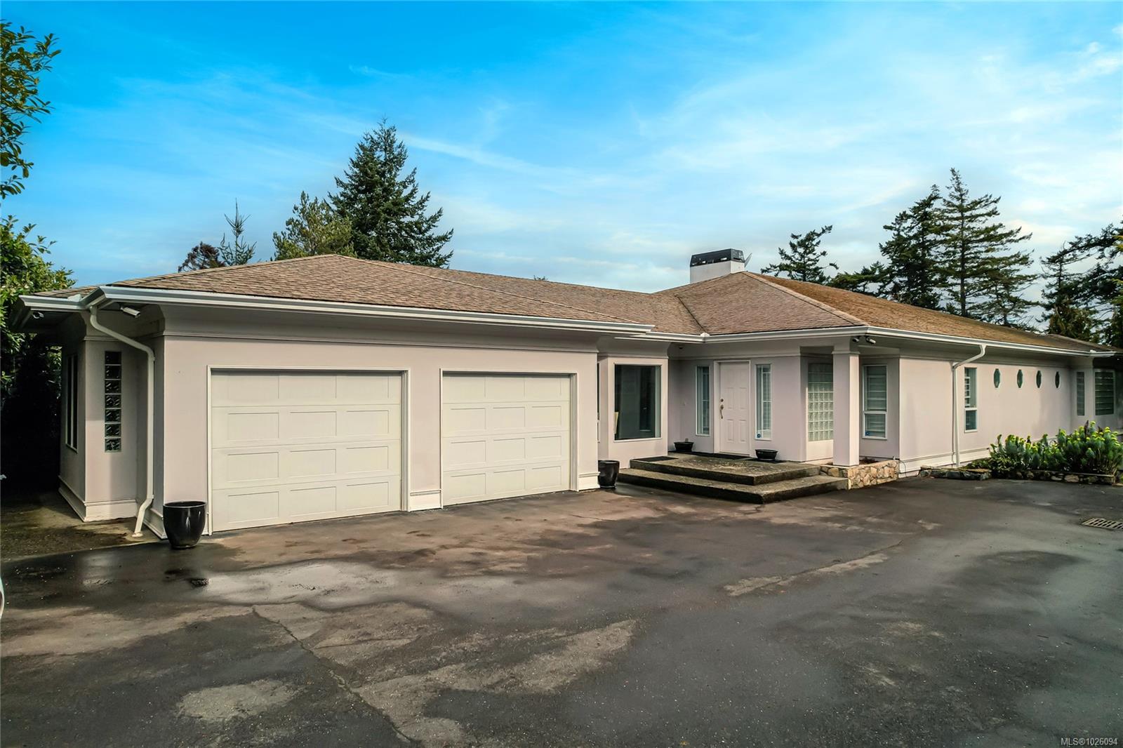 This special custom residence offers approximately 6,400 sq. ft. of living space, including a spacious 3–4 bedroom suite on the lower level, and is set on a very private, secluded half-acre in the heart of Gordon Head. Just moments from Arbutus Cove, the home enjoys distant ocean views from principal living areas overlooking beautifully landscaped gardens with a koi pond and custom gazebo—perfect for entertaining and summer BBQs. From the moment you enter, the scale and drama of the floor plan are evident. Highlights include 14-ft ceilings, floor-to-ceiling windows, skylights, hardwood floors, French doors, and an impressive grand living room and great room designed for both family living and entertaining. A private, secure setting close to UVic, top schools, parks, and beaches.